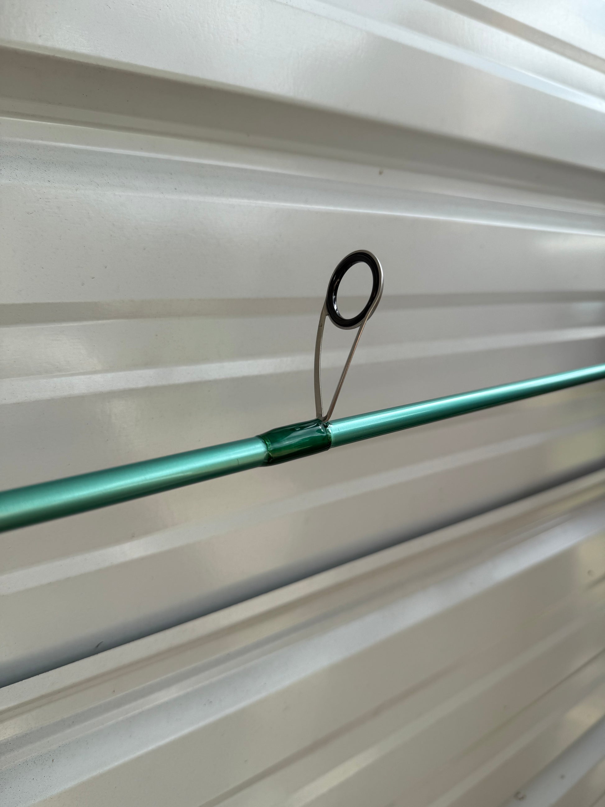 Rod will come as pictured; seafoam colored rod with high-frame Fuji KLH single-foot alconite spinning guides, Fuji reel seat VSS with matching EVA foam butt cap and cool mint colored guide wraps.