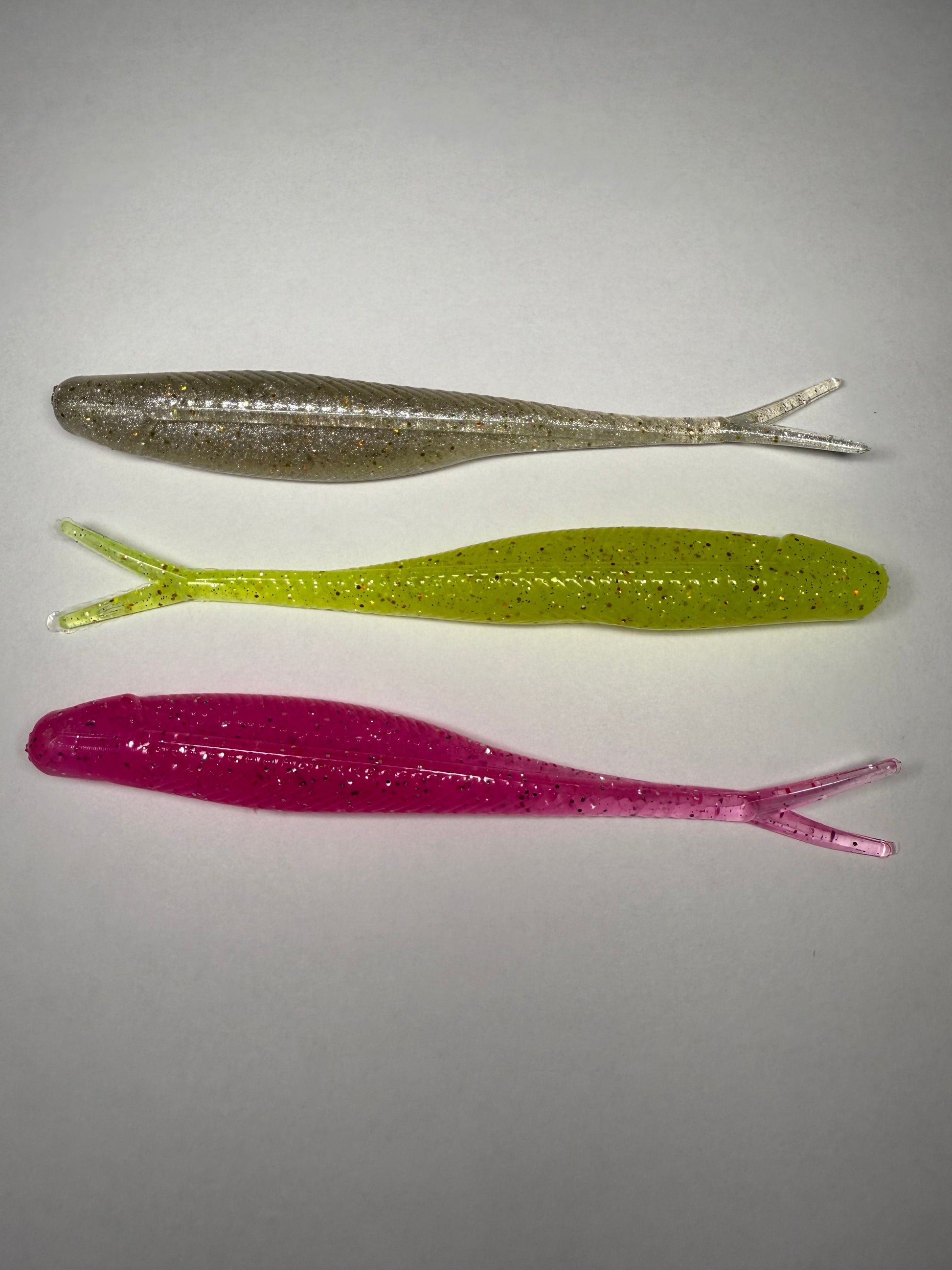 Comes in a pack of 4, our 5 inch Tracer jerk bait is good for fisherman utilizing hover rig or strolling techniques. Works well with jig heads.